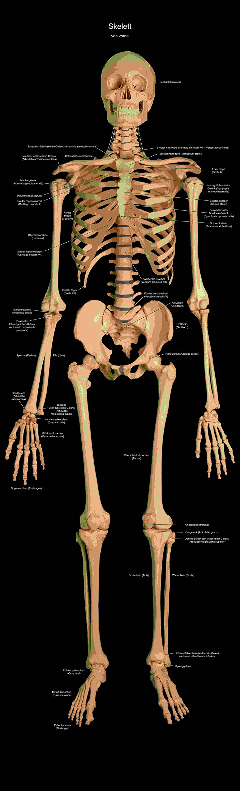Das Skelett eines neugeborenen Kindes besteht zunächst noch aus mehr als 300 Knochen beziehungsweise Knorpeln die im Verlauf der körperlichen Entwicklung teilweise zusammenwachsen und dabei immer fester und belastbarer werden. Wenn du den Mauszeiger über die Abbildung bewegst erfährst du die Namen der einzelnen Knochen.